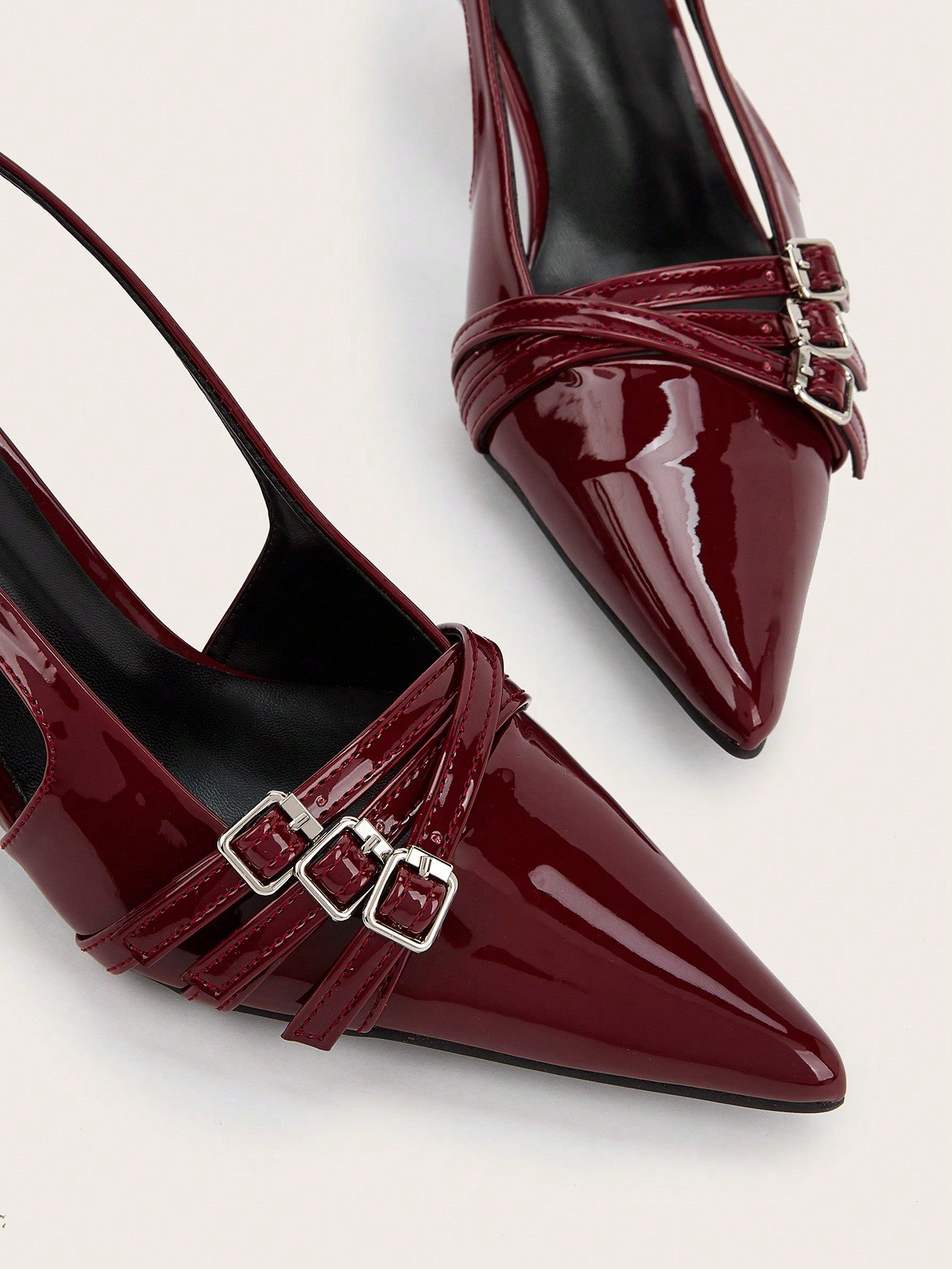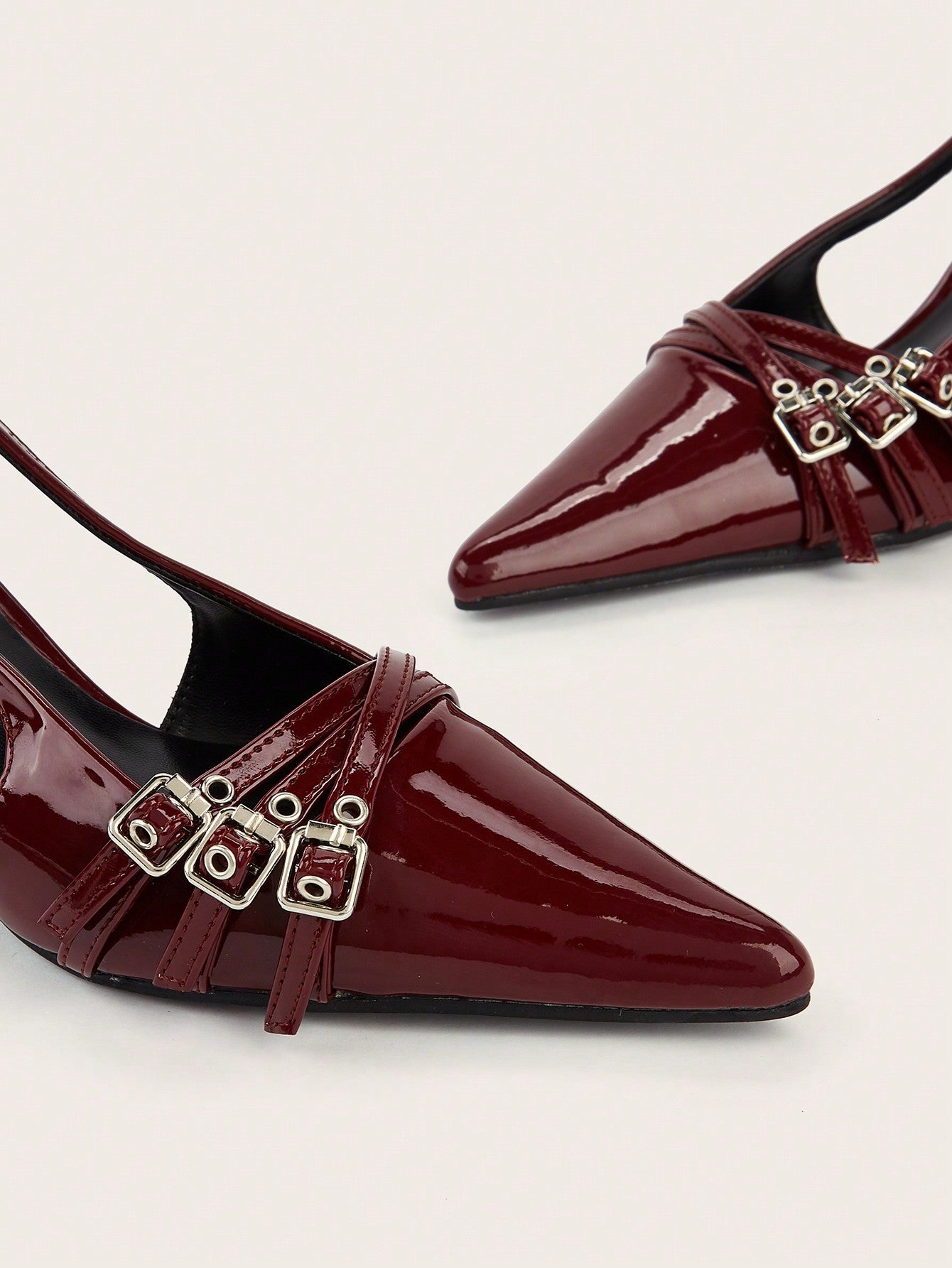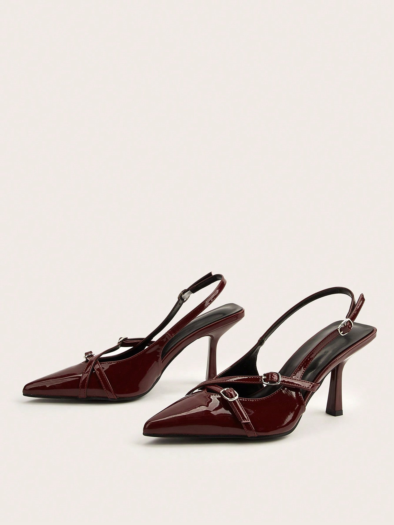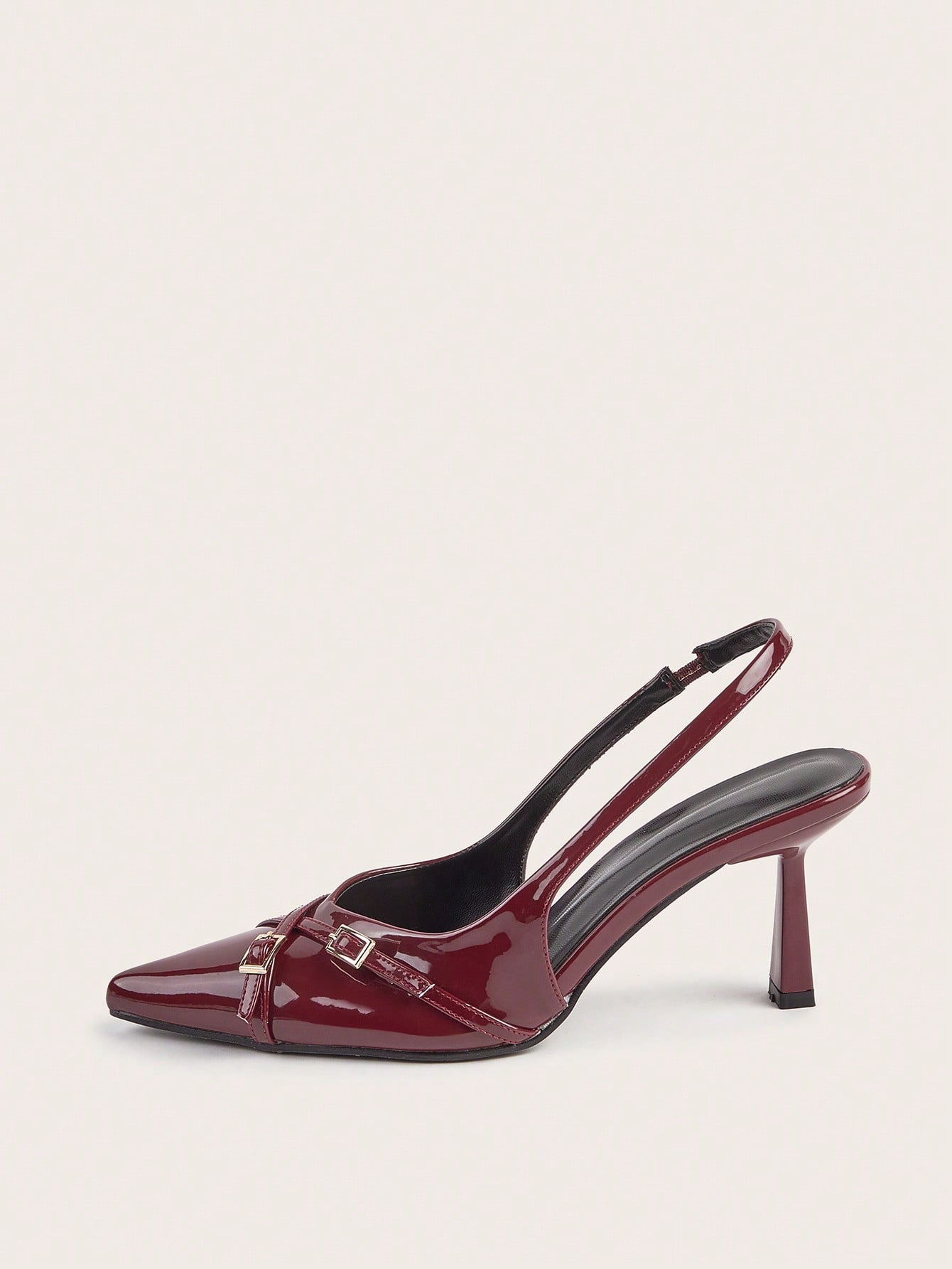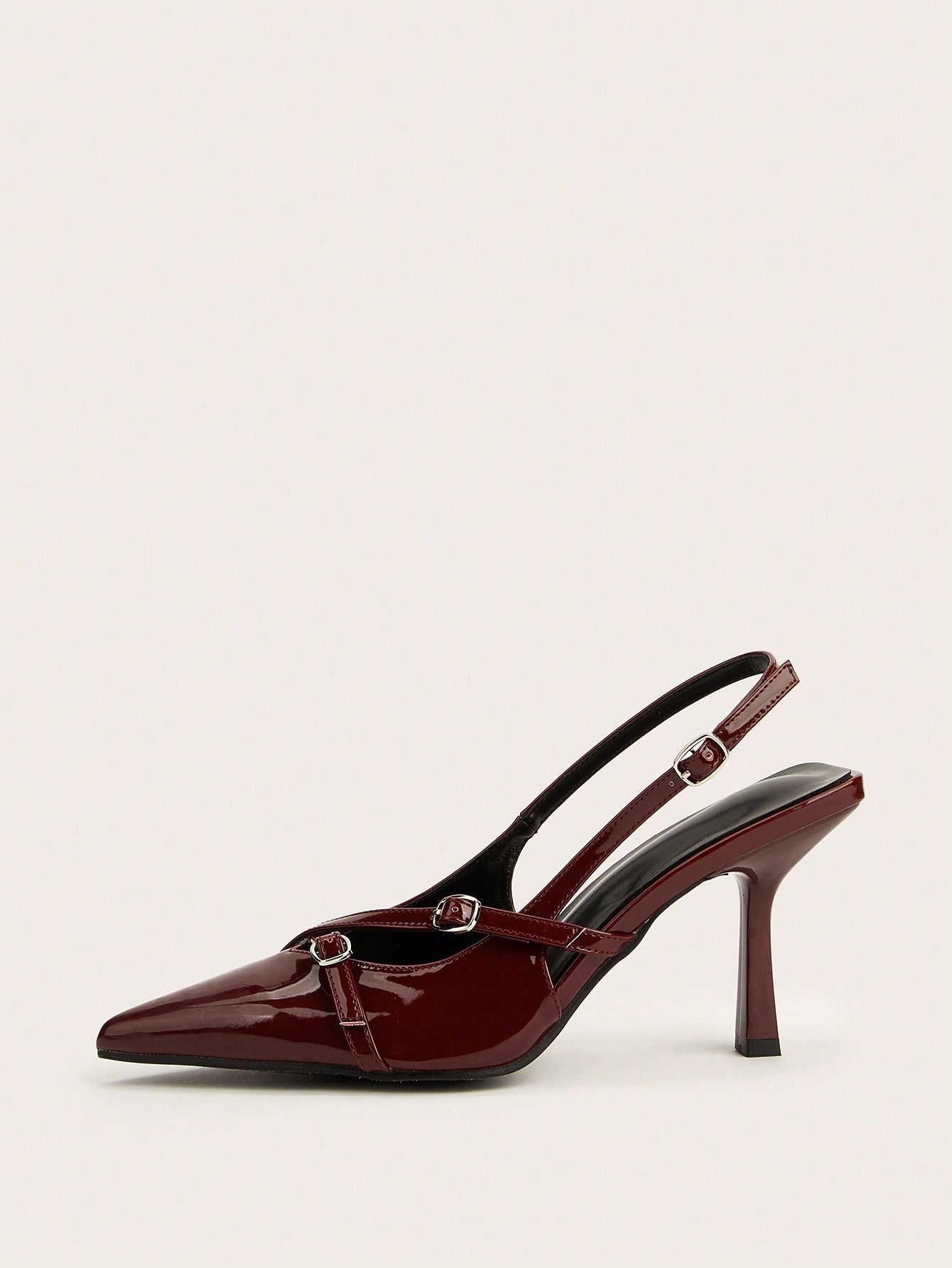 Wedding Party Sexy Burgundy Patent Leather Pointed Toe Metal Buckle Strap Stiletto High Heels