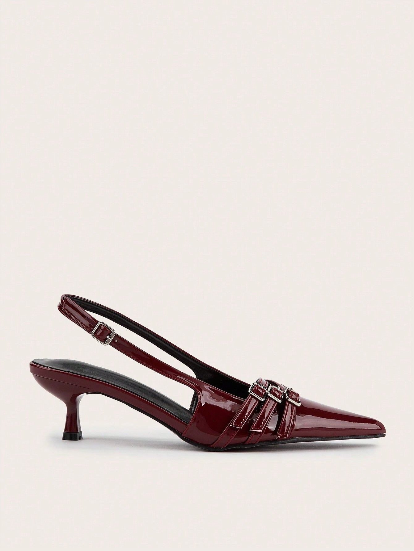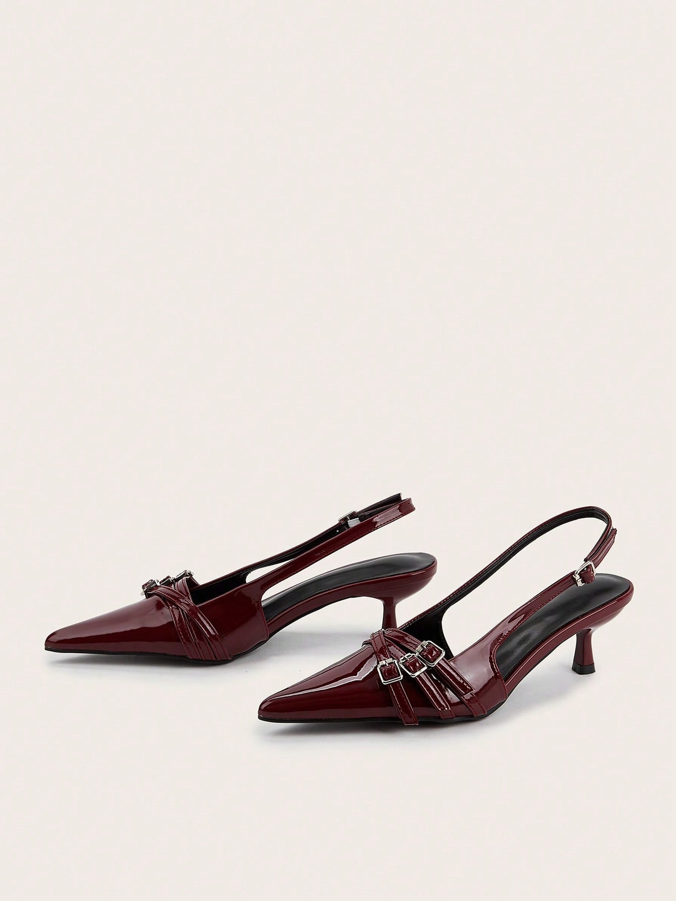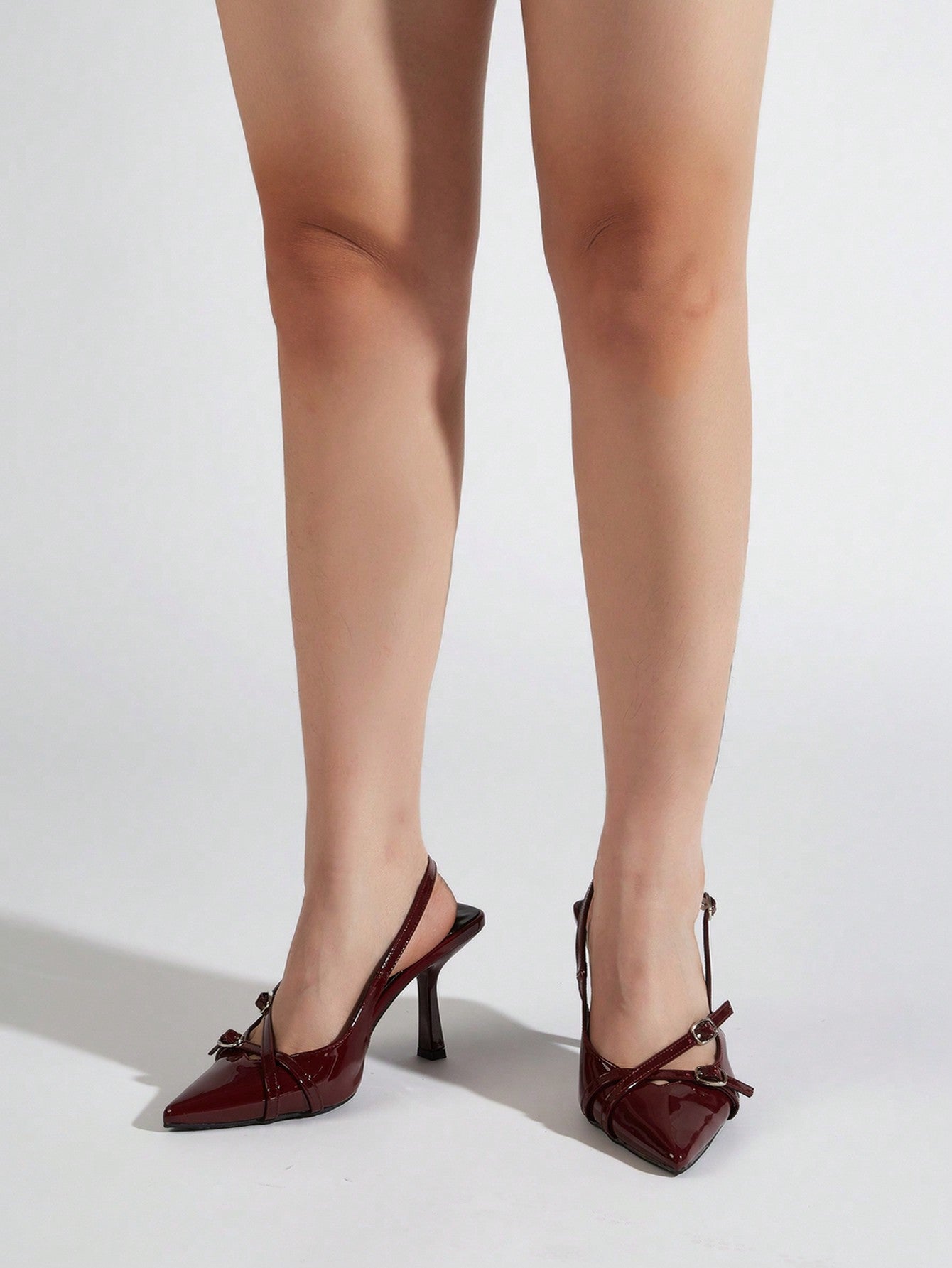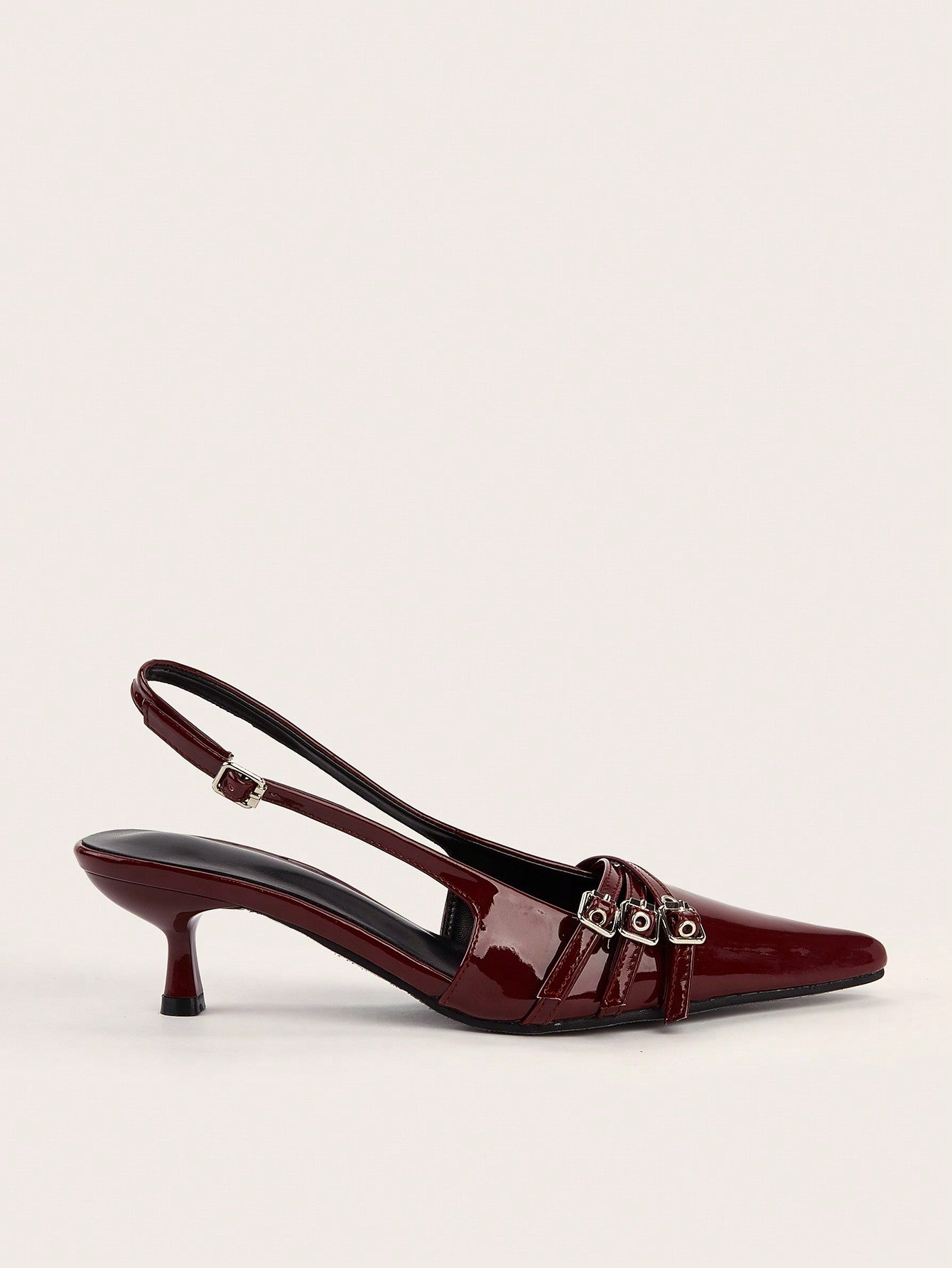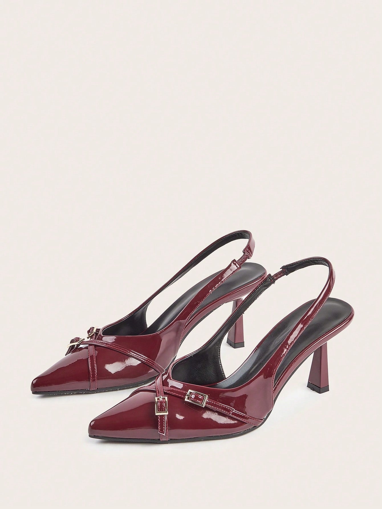 Wedding Party Sexy Burgundy Patent Leather Pointed Toe Metal Buckle Strap Stiletto High Heels