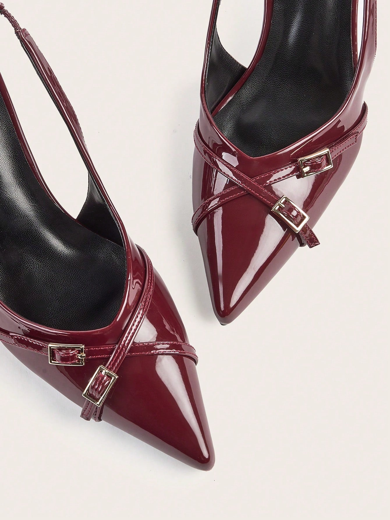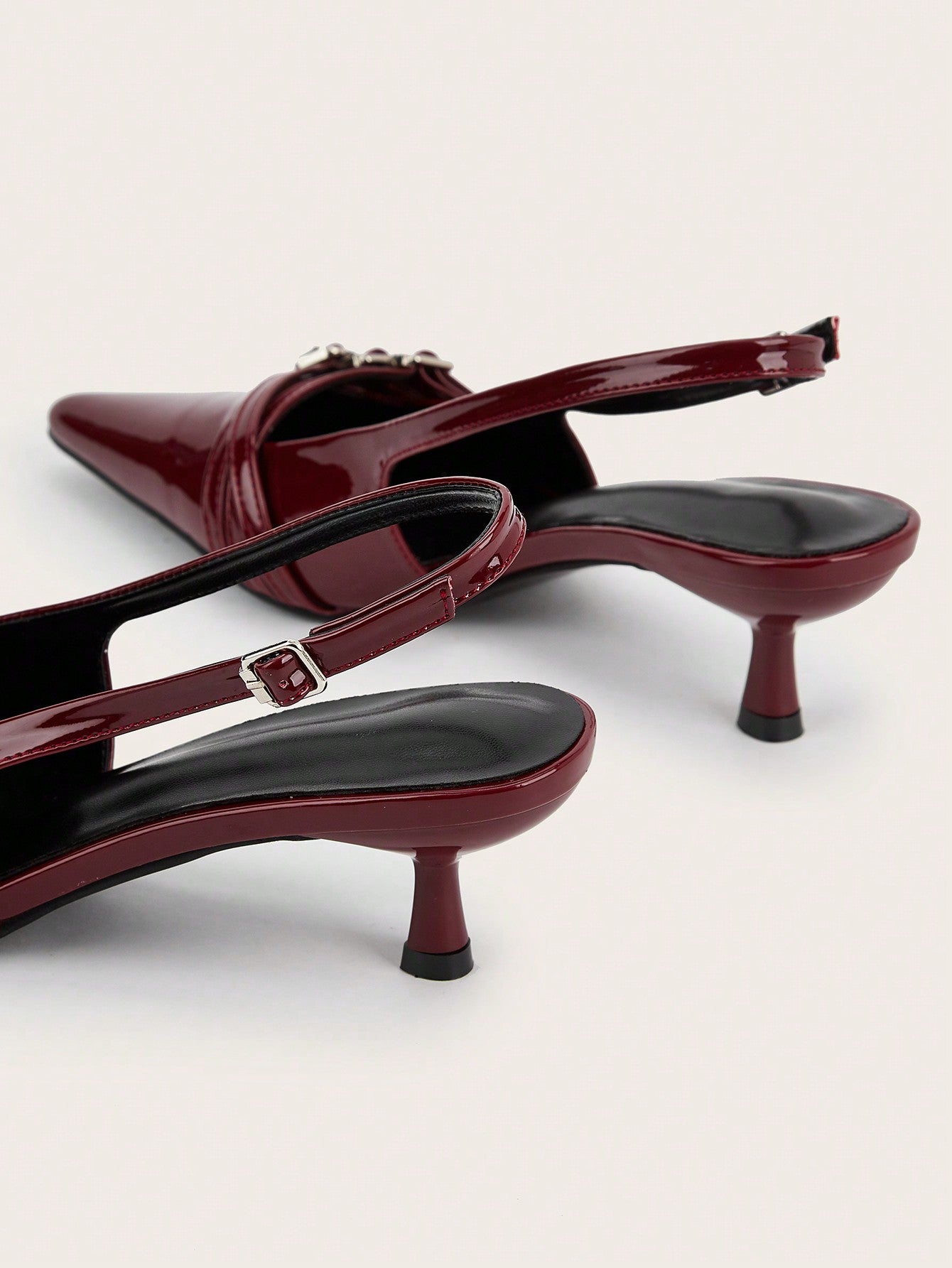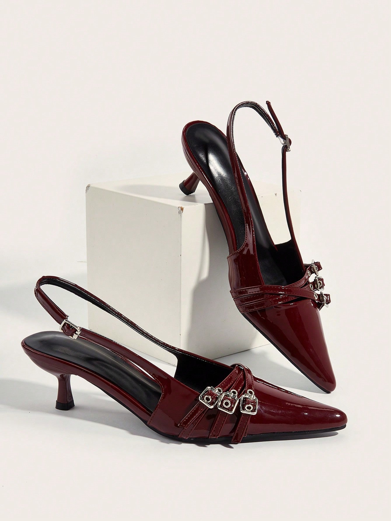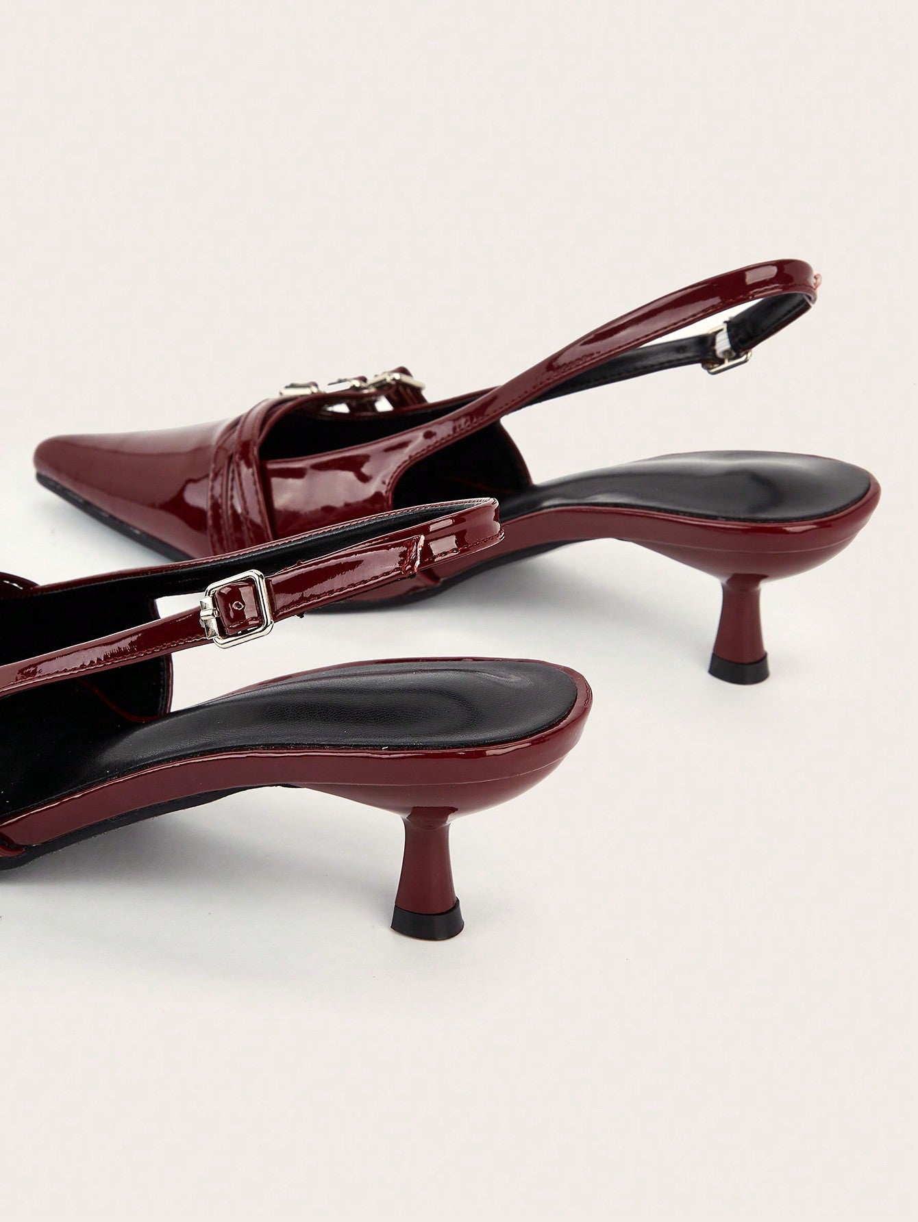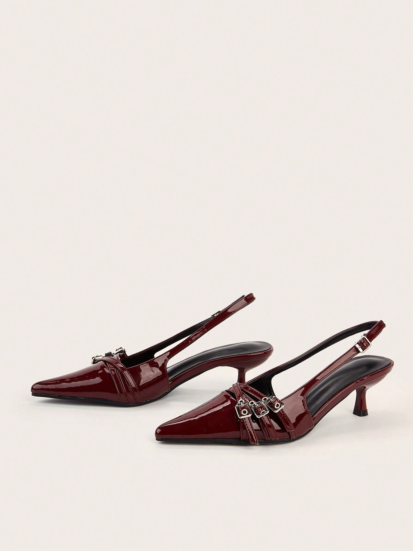 Wedding Party Sexy Burgundy Patent Leather Pointed Toe Metal Buckle Strap Stiletto High Heels