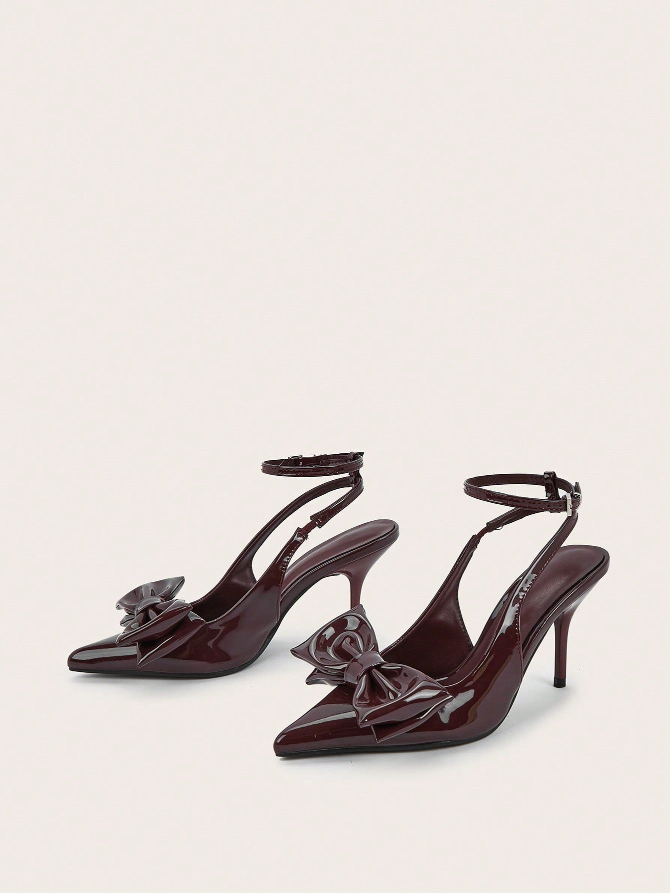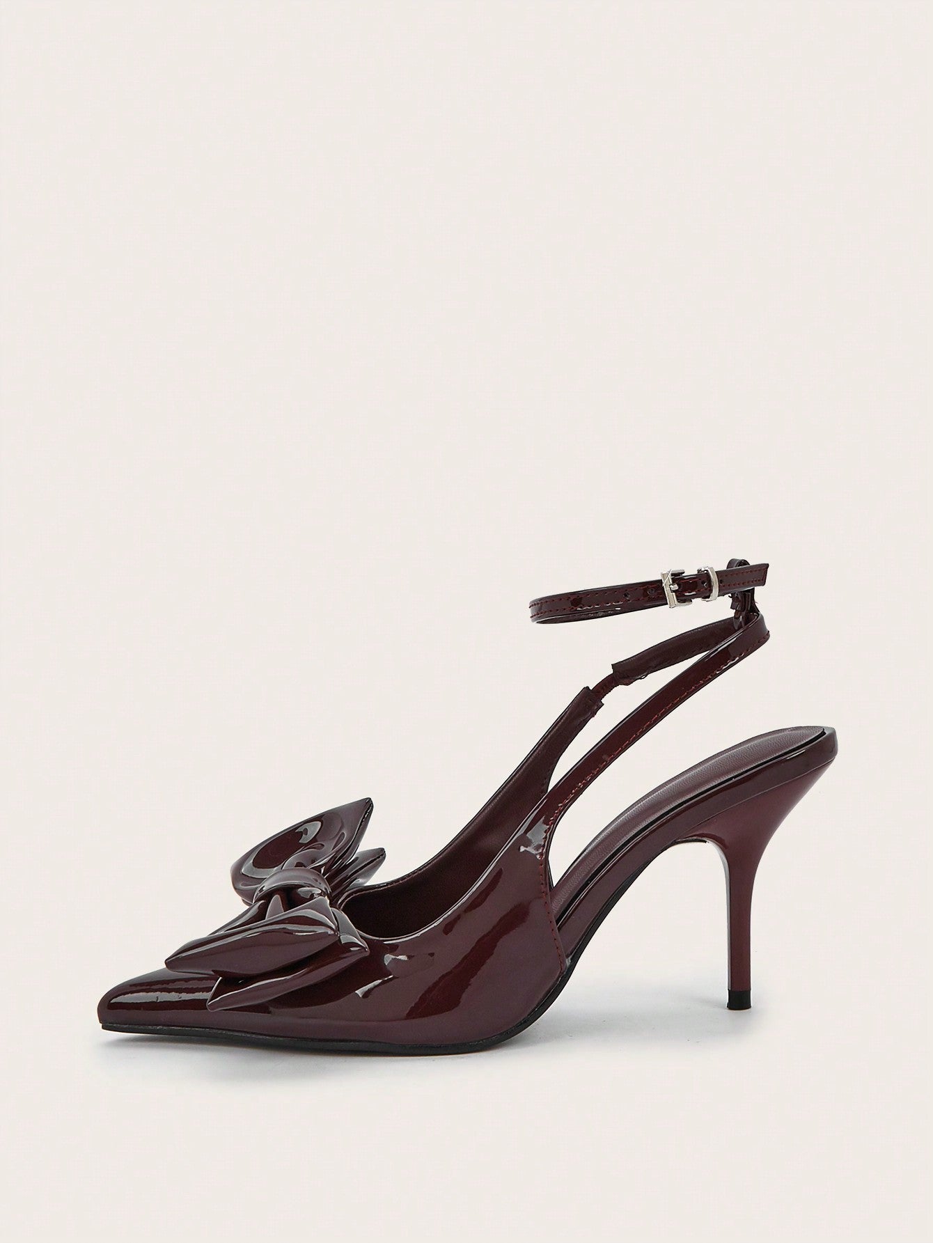 Sexy And Elegant Pointed Toe Patent Leather Stiletto High Heels With Metal Buckle Strap, Wine Red, For Wedding And Party