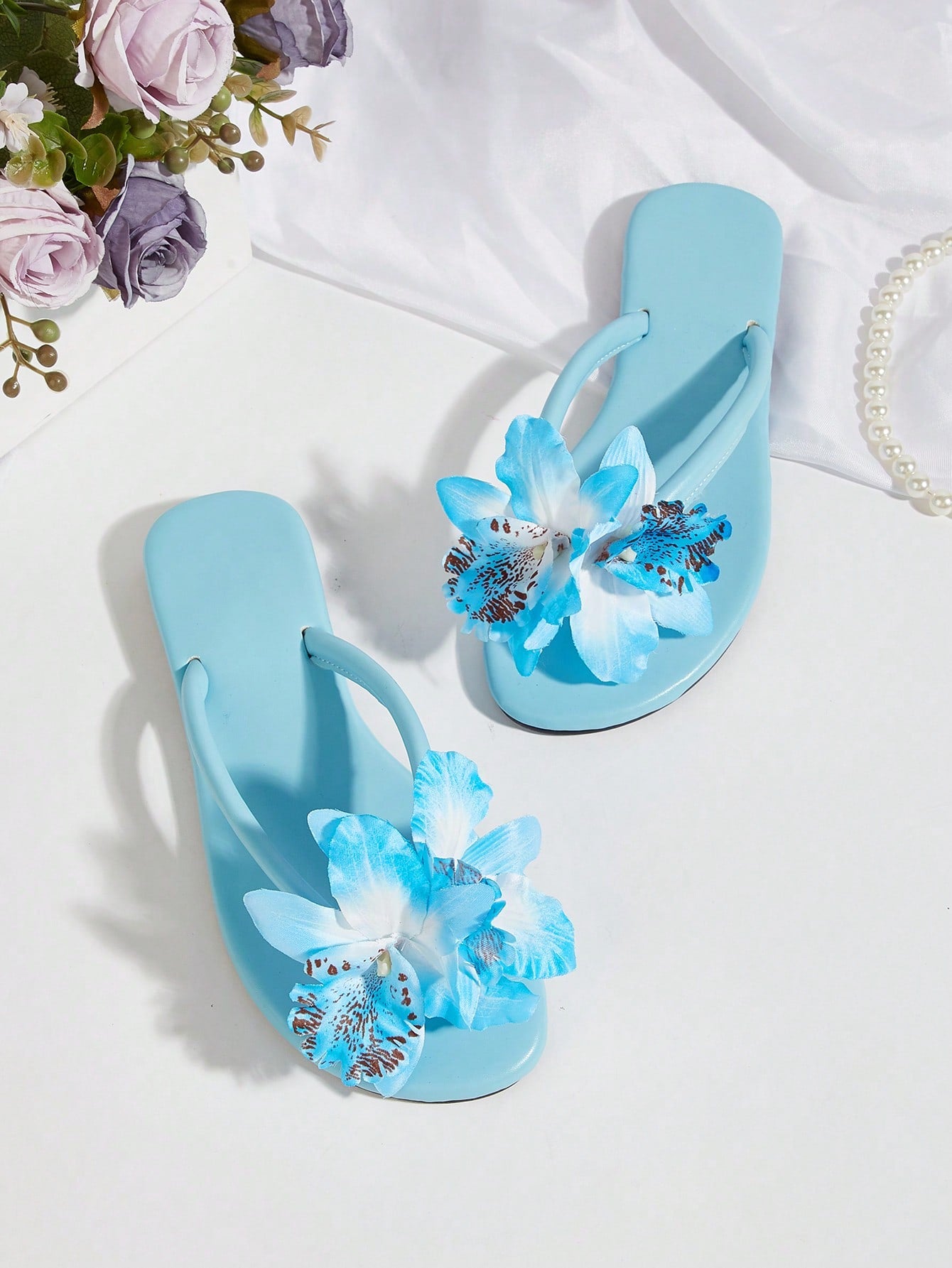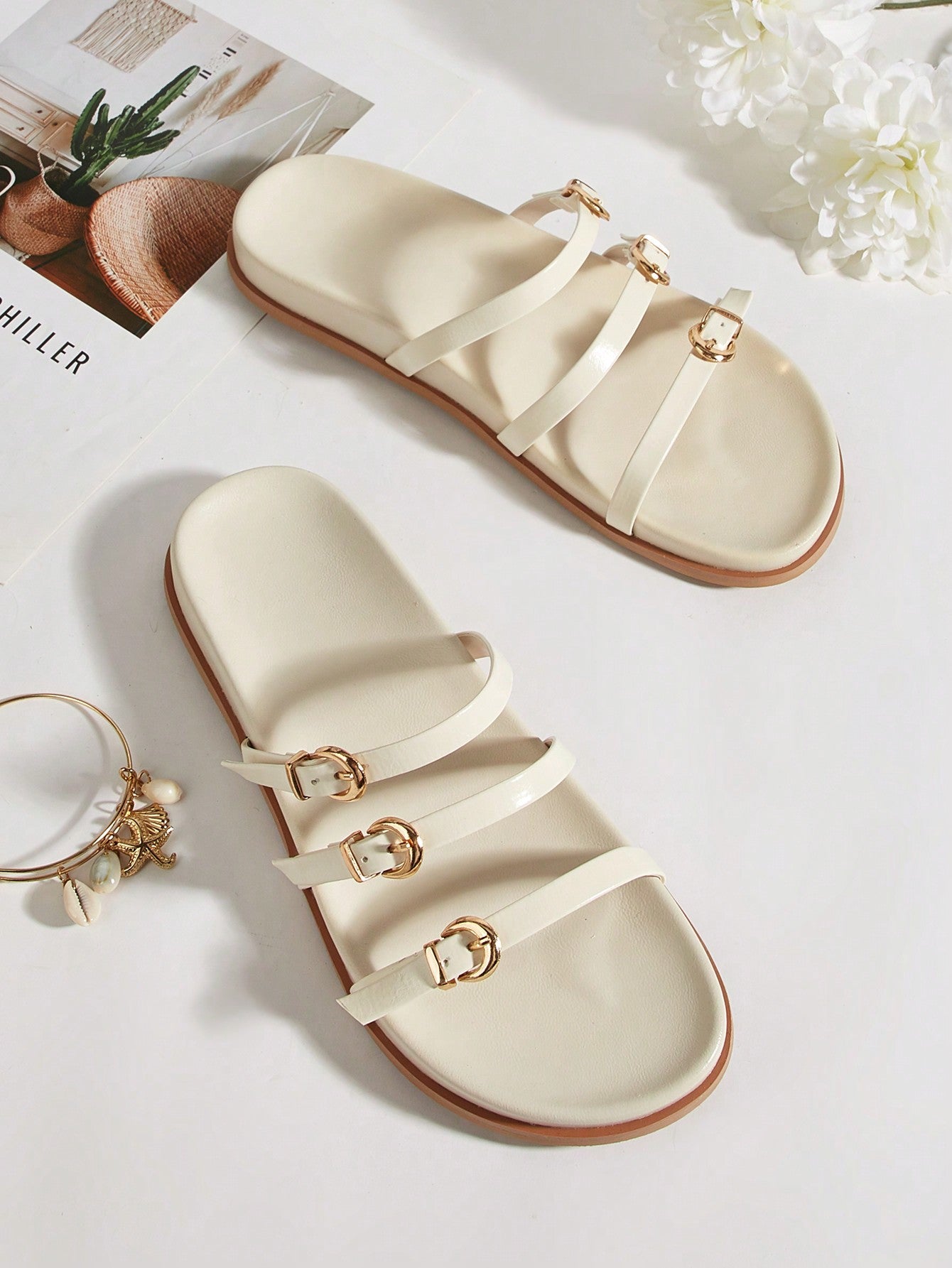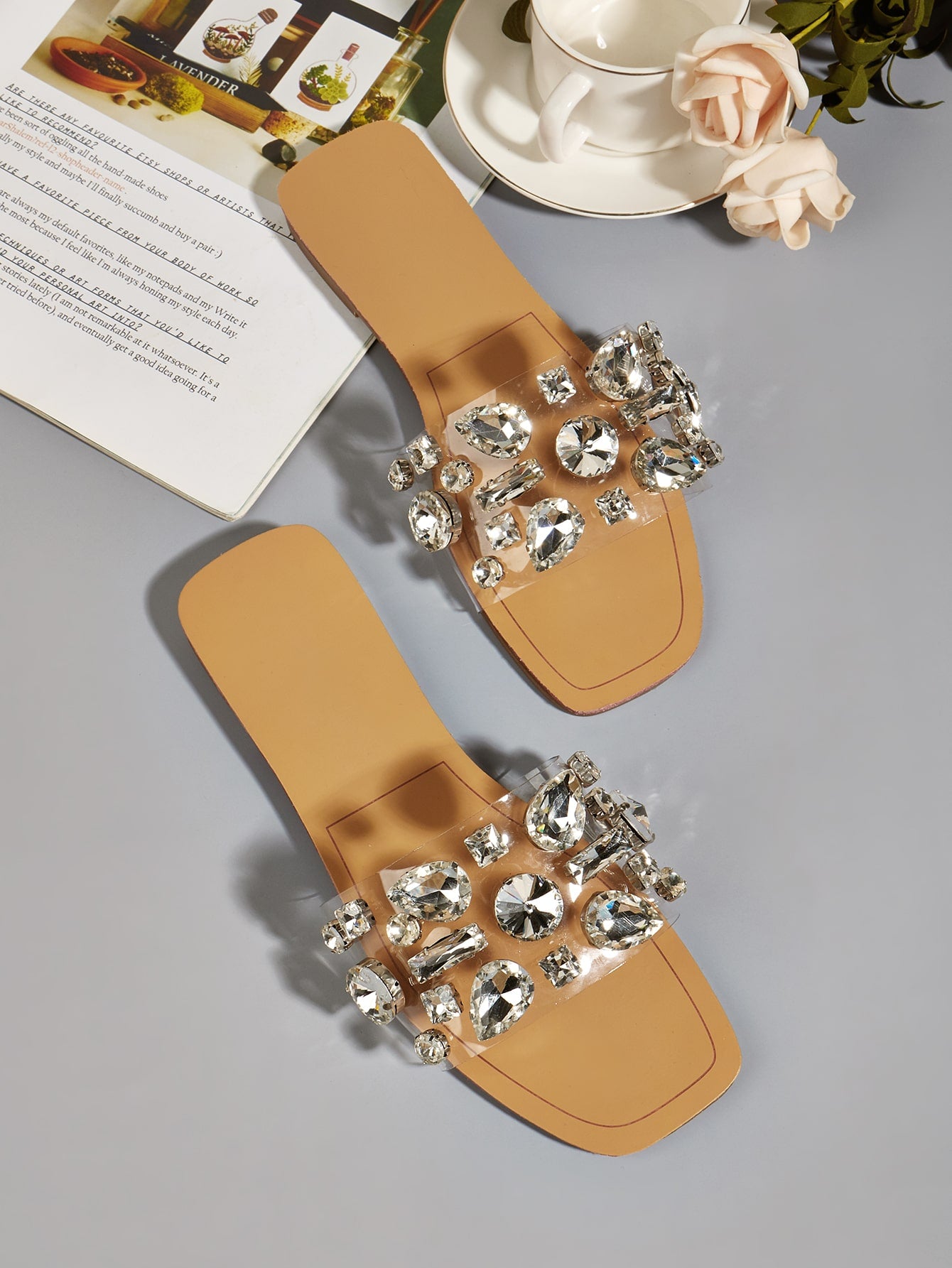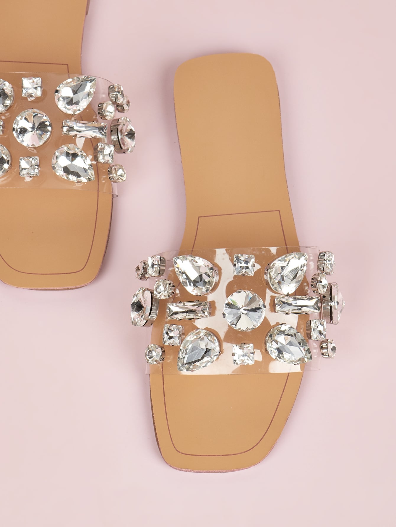 Women Gemstone Decor Slide Sandals, Glamorous Open Toe Flat Sandals